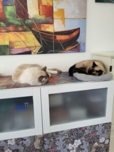 (pic is our cats Noodles (right) and S’mores (left) sleeping on a sideboard)
